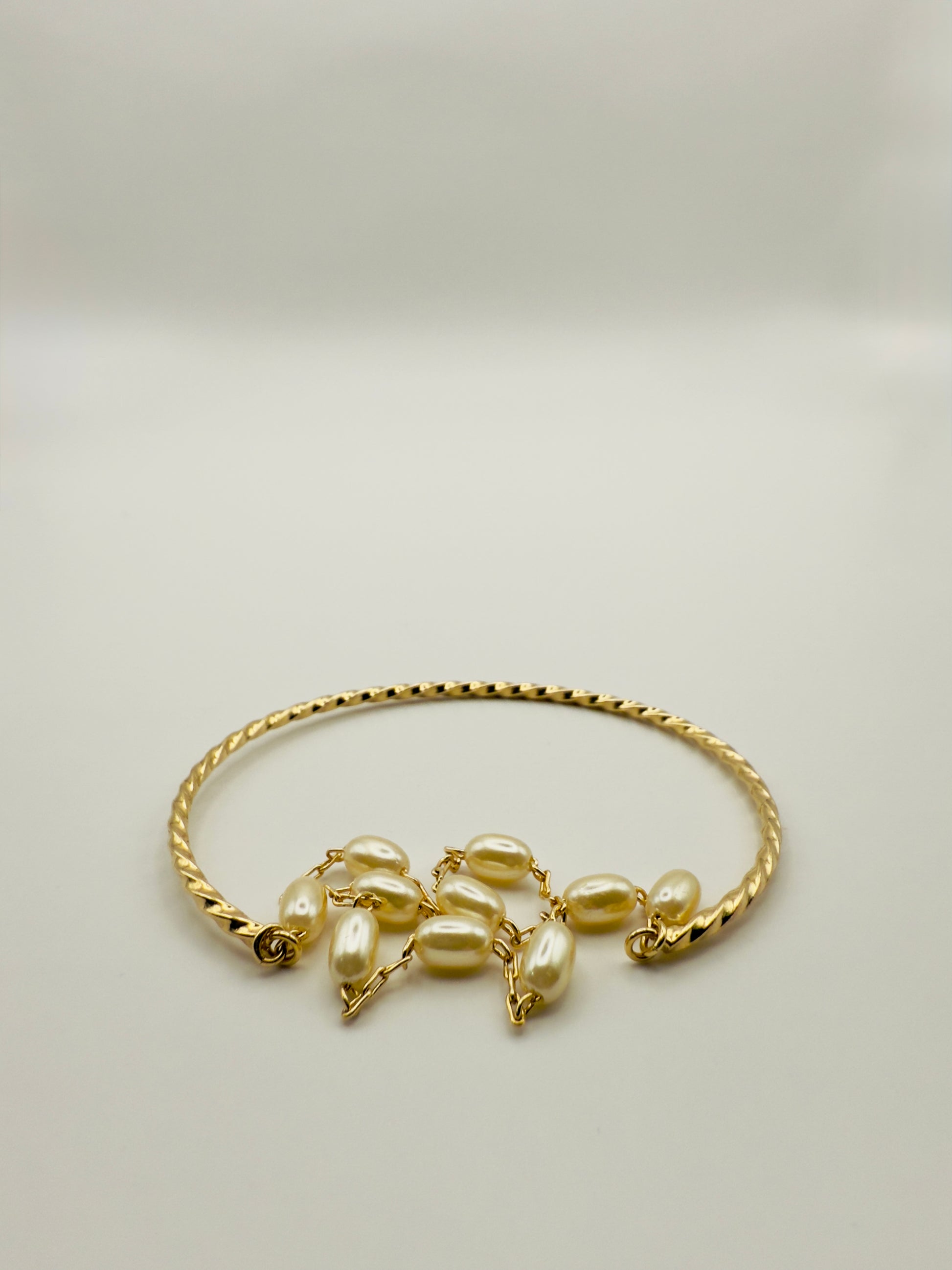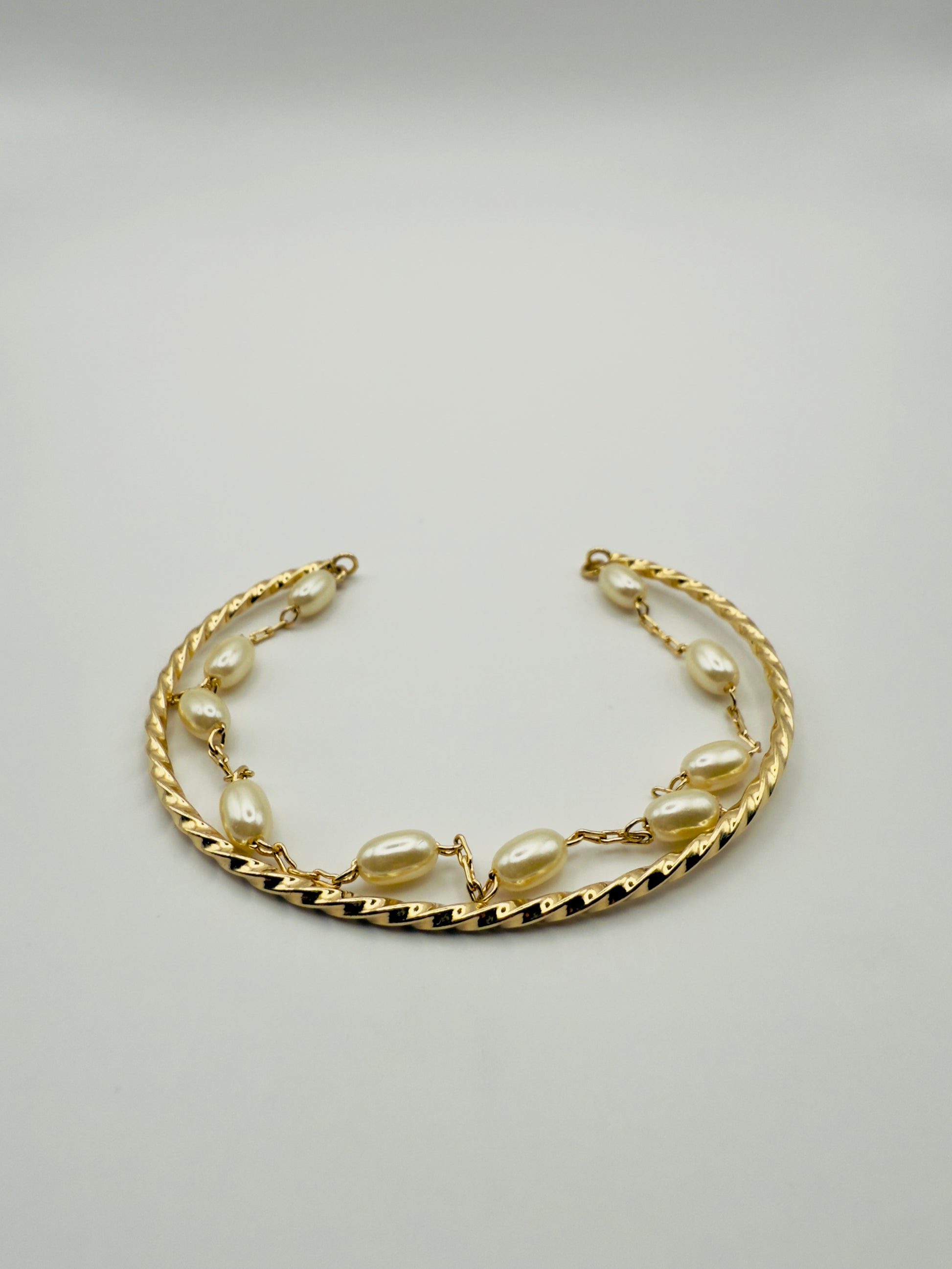 -Dual-layer open cuff: twisted gold & pearl chain
